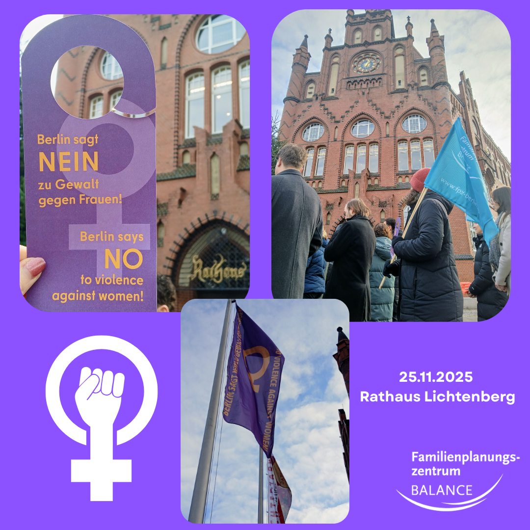 Vor dem Rathaus Lichtenberg wurde am 25.11. die Fahne mit der Aufschrift "Berlin sagt nein zu Gewalt gegen Frauen! " gehisst.